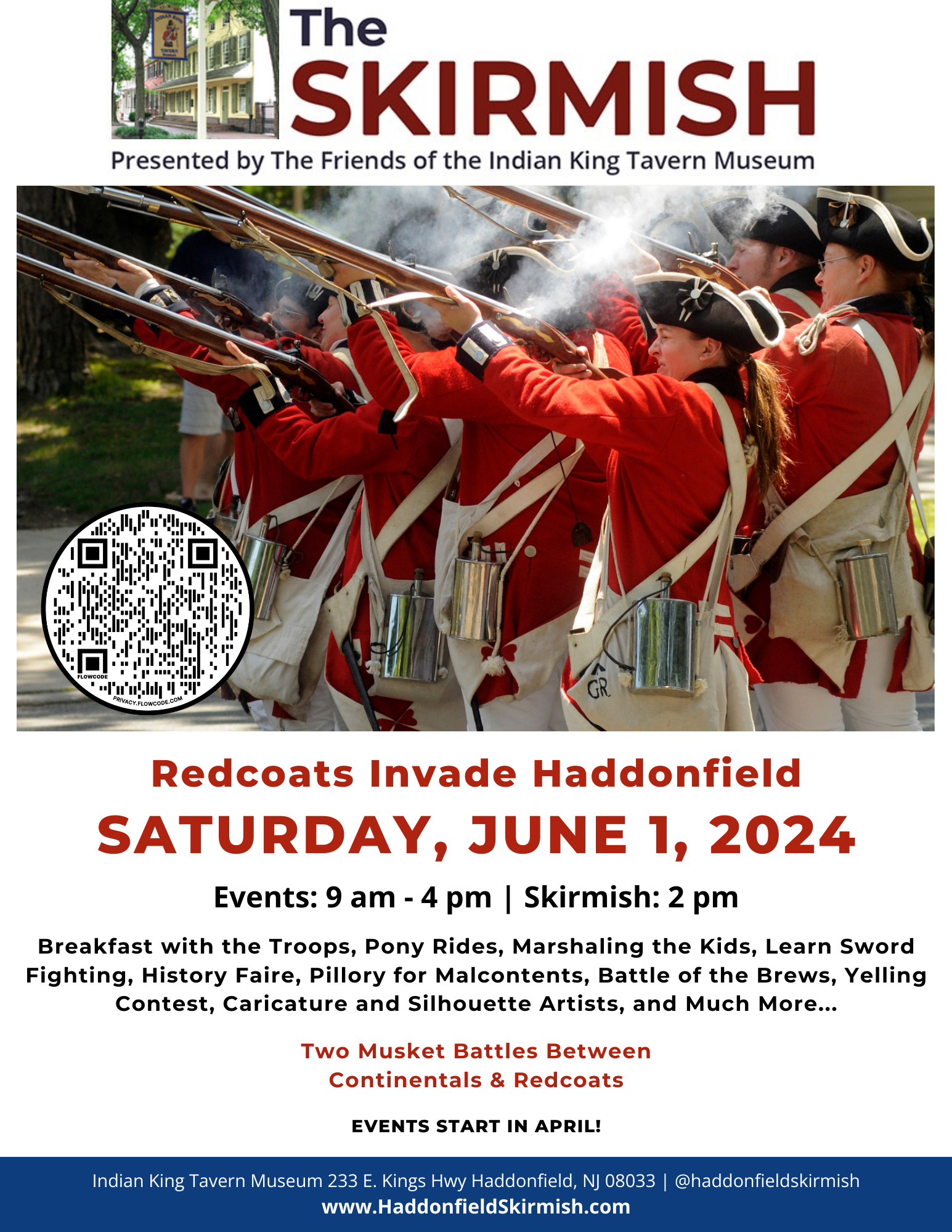 A mini-skirmish takes place at 11 a.m. and the full skirmish takes place at 2 p.m. in front of the historic Indian King Tavern Museum on Kings Highway.